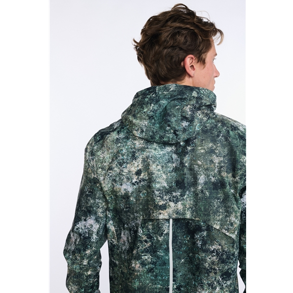 Kudottua kangasta, jossa on joustava ja säädettävä 3-osainen huppu. Ympäristövastuullinen C6 DWR-pintakäsittely sateen kestämiseksi.