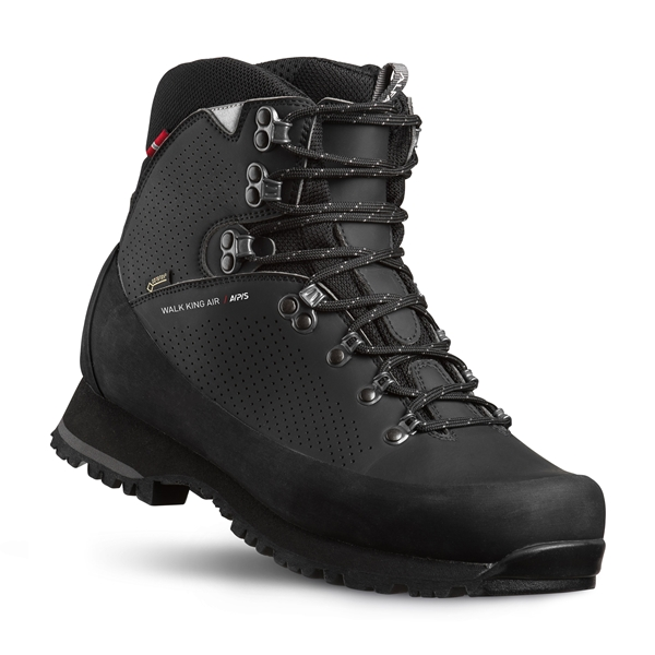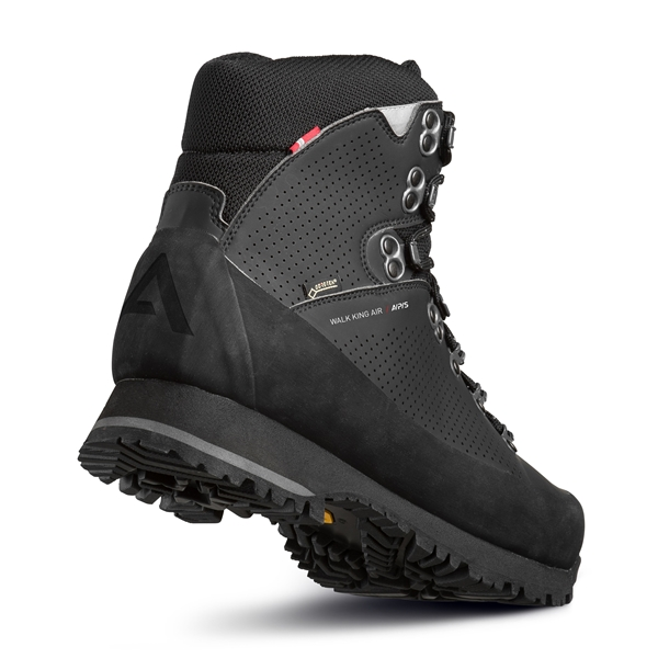 Alfa Walk King Air Aps on täysin synteettinen, kevyt ja huoltovapaa miesten vaelluskenkä. Kengät on valmistettu kestävästä Alfa Air -materiaalista, joka on erittäin hengittävä ja vähän huoltoa vaativa ja joka yhdessä Gore-Tex-kalvon kanssa tarjoaa erinomaisen vedenpitävyyden ja hengittävyyden. Alfa Air on täydellinen materiaali lämpimille päiville, ja se tekee saappaista ihanteelliset kolmelle vuodenajalle, loppukeväästä alkusyksyyn. Kengissä on XL-mallinen lesti, jossa on tilava etujalkaterä ja vakaa istuvuus, joka takaa repeytymiskestävyyden, sekä pyöristetty kantapään muoto, joka vähentää rakkuloiden riskiä. Jotta seikkailusi olisi mahdollisimman mukava, nilkkojen ympärille on sijoitettu Memory Foam -vaahtomuovia, jotka muokkautuvat kehonlämmön mukaan, kun taas Double Lock -nauhoitusjärjestelmä lisää saappaiden vakautta kaksinkertaisilla lukituskoukuilla, jotka yksinkertaistavat akselin yksilöllistä säätöä ja räätälöintiä. Pohjissa on toimiva yhdistelmä pehmustusta ja pitoa; hengittävästä, hyvin imukykyisestä materiaalista valmistetussa anatomisesti muotoillussa pohjassa on vaahtomuovirakenne pehmusteena ja antibakteerinen pinta, stabiloiva L-levy, Combo-välipohja, jossa yhdistyvät pehmuste- ja stabiloivia kerroksia, sekä pehmeä, tekstiilijalkineisiin mukautettu Vibram Grip APS -ulkopohja. Ulkopohjassa on kuvio, joka antaa tasaisen pidon ja estää maaperän ja soran tarttumisen, muotoillut nupit, jotka antavat turvallisen pidon epätasaisilla pinnoilla, ja hyvin määritelty koroke, joka antaa lisäpitoa ulospäin suuntautuvissa rinteissä. Muuten vaelluskengissä on pehmeä yläreuna, vahvistus ympäri kengän pohjaa, teipatut saumat lisäävät vedenkestävyyttä ja kyllästetyt nauhat estävät veden imeytymistä.