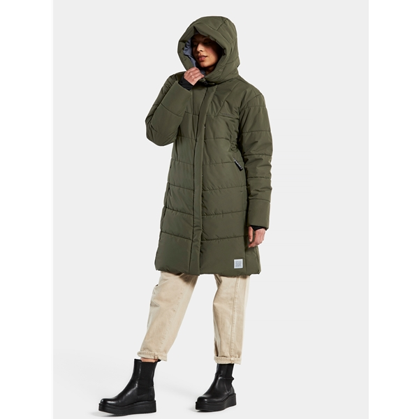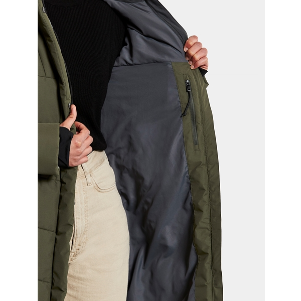 Didriksons Amina Wns Parka on lämmin, topattu naisten parka, joka sopii jokapäiväiseen käyttöön. Takki on valmistettu vettähylkivästä ja hengittävästä materiaalista, ja siinä on kierrätyskuiduista valmistettu pehmuste. Vuori on värjätty liuosvärjäystekniikalla, joka säästää vettä, energiaa ja kemikaaleja prosessin aikana. Hihat voidaan helposti taittaa ylös, jos haluat lyhyemmän hihan pituuden, ja joustavat hihansuut, joissa on peukaloreiät, antavat lämpöä ja mukavuutta. Parakassa on myös kiinteä, säädettävä huppu, täyspitkä kaksisuuntainen vetoketju edessä, kaksi vetoketjullista sivutaskua, vetoketjullinen sisätasku ja älykäs heijastava yksityiskohta hihansuiden sisäpuolella, joka taittuu tarvittaessa ulos.