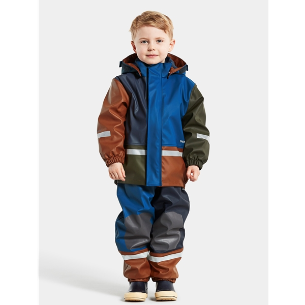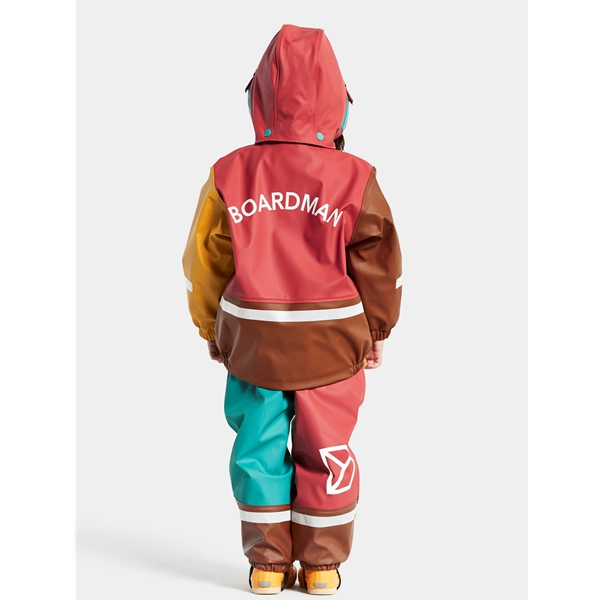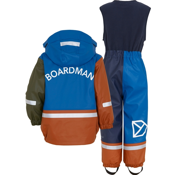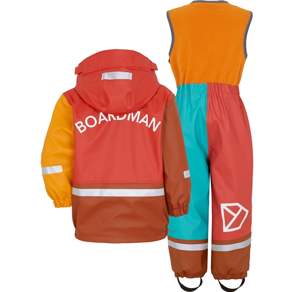 Didriksons Boardman Kids Mult Set on tuulenpitävä ja vedenpitävä sadepuku lapsille, jossa on näkyvät heijastukset 360 asteessa. Sadeasu on valmistettu Galon®-materiaalista, jossa on 100 % vedenpitävät hitsatut saumat, ja se on vuorattu lämpimällä ja miellyttävällä fleecellä. Hihansuissa, takin alaosassa ja housujen lahkeensuissa on joustava vyötärönauha, ja niiden sisällä on Galon®, joka estää veden pääsyn sisään. Housuissa on myös lisävahvikkeet polvissa, fleecevuori lisää lämpöä ja mukavan istuvuuden sekä säädettävät ja vaihdettavat silikoniset jalkahihnat. Takissa on myös irrotettava, fleecevuorattu huppu, jossa on tarranauhasäätö, ja täyspitkä vetoketju, jossa on tuulisuoja. Sisäpuolella on myös nimikyltit, joissa on tilaa useammalle nimelle.