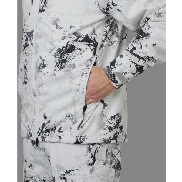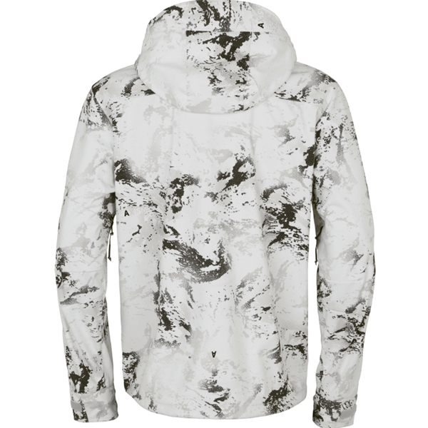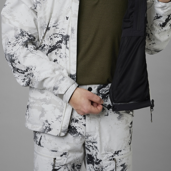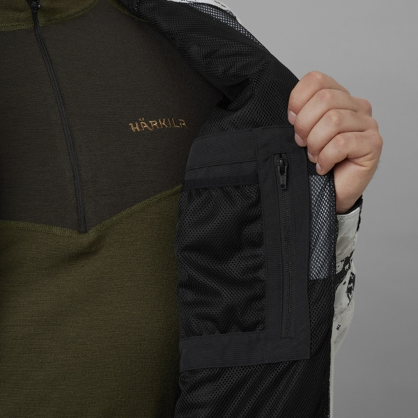 Takki on naamioitu Härkilan omalla AXIS MSP Snow® -naamioinnilla, joka on edelleen kehitetty Härkilan suositusta AXIS MSP® -naamioinnista. Aktiivisen talvimetsästyksen aikana on erityisen tärkeää, että mahdollisimman paljon kosteudesta poistuu keholta. Tämän on Härkila ottanut huomioon. Sen lisäksi, että takki poistaa kosteutta, hengittää erittäin hyvin ja siinä on sisäpuolinen mesh-vuori, joka antaa paremman ilmavaihdon, on siinä myös pitkät, vetoketjulliset tuuletusaukot kainaloissa niin, että voit viilentää itseäsi, kun olet saanut sykkeesi kohoamaan. Lisäksi takissa on likaa ja vettä hylkivä DWR-käsittely.