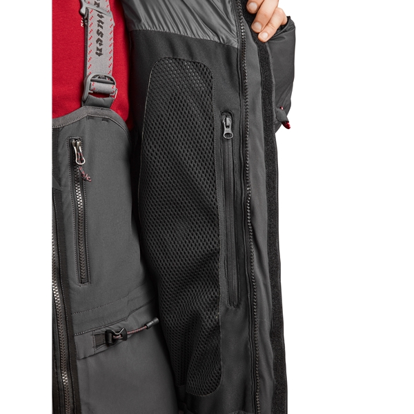 Klättermusen Nifelheim Jacket M’s on miesten lämmin untuvatakki vuorikiipeilyyn. Tämä takki on valmistettu vedenpitävästä hanhenuntuvasta 90/10 (90 % hanhenuntuvaa, 10 % höyheniä), ja se on valmistettu Box-rakenteella, jotta untuvat pysyvät paikallaan välttäen kylmät alueet. Se on vahvistettu olkapäistä ja niskasta, ja siinä on pehmustetut tuulensuojat kaksisuuntaisen vetoketjun päällä. Huppu sopii useimpien kypärien päälle ja on säädettävissä kolmessa kohdassa, ja se on varustettu Windvisor-lipalla. Takissa on myös vetoketjun turvasolki, suuret mesh-taskut sisäpuolella, kaksi suurta käsienlämmittelytaskua, vetoketjullinen turvatasku ja heijastava kolmio.