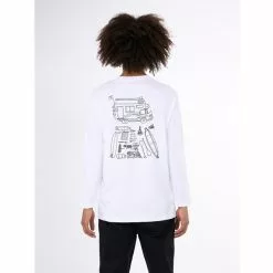 Alkuperäinen teksti: Build your everyday wardrobe with a timeless classic that will last through seasons. United by true-to-nature values, we are proud to present a set of original artwork by our friend Jonas Claesson. This long-sleeved T-shirt is made in 100% soft organic cotton. The travel back print is an artistic interpretation exploring the brand’s attitude, vision, and dreams. Designed in a regular fit with a rounded neckline and our owl logo on the chest.