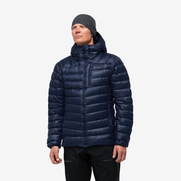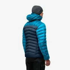 Kompromisseja tarjoava miesten kevyt hupullinen untuvatakki topptur-retkille.