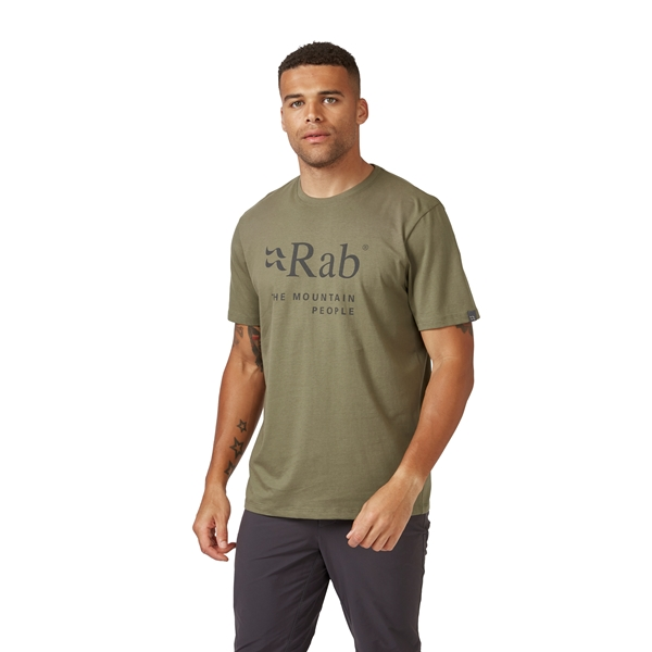 Pehmeä ja kestävä, lyhythihainen miesten t-paita, jossa on Rab-logo rintapainatuksena ja ensiluokkainen, ekologinen puuvillarakenne.