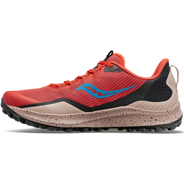 Saucony Peregrine 12 Men soveltuvat juoksijalle, joka etsii kevyitä ja monikäyttöisiä miesten polkujuoksukenkiä, päästäkseen sinne minne askeleet vievät. Uusi versio on saanut useita hienoja päivityksiä, kuten lisää mukavuutta, 11 % vähemmän painoa, lisää joustavuutta ja enemmän mukautuvuutta. 4 mm droppi ja syvän kuvioinnin omaava 5 mm PWRTRAC-kumipohja tarjoaa erinomaisen maakosketuksen, pidon ja juoksutuntuman alustasta riippumatta. Ulkopohjan sisäpuolella on integroitu ROCK PLATE -hiilikuitukangas, joka jakaa painetta ja suojaa jalkaa teräviltä kiviltä ja juurilta. Kengässä on myös kiinnitysmahdollisuus damaskeille, paremman juoksukokemuksen saamiseksi maastossa, myös polkujen ulkopuolella. Erittäin hyvin iskuja vaimentavan PWRRUN-välipohjan ja uuden PWRRUN+-pohjallisen sekä hyvän joustavuuden ansiosta Peregrine 12 soveltuu myös soralla ja asfaltilla juoksemiseen. Ainutlaatuinen, polkujuoksuun sovitettu FORMFIT-istuvuus luo optimaalisen räätälöidyn istuvuuden koko jalan ympärille. Välipohjan anatomisesti muotoiltu yläosa ympäröi jalan tarjoten parempaa tukea kantapään ja jalan kaaren ympärille. Päällinen ympäröi jalkaa mukavasti ja vakaasti välipohjan korkean reunan ja muokattavan, saumattoman ja hyvän hengittävyyden omaavan verkkomateriaalin, sekä siihen yhdistetyn, jalkapöydän ympärillä olevan, vakauttavan 3D-rakenteen ansiosta. Lisäksi päällinen koostuu kierrätettävästä materiaalista, ekologisen jalanjäljen pienentämiseksi.